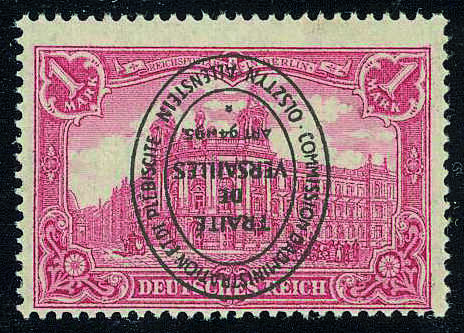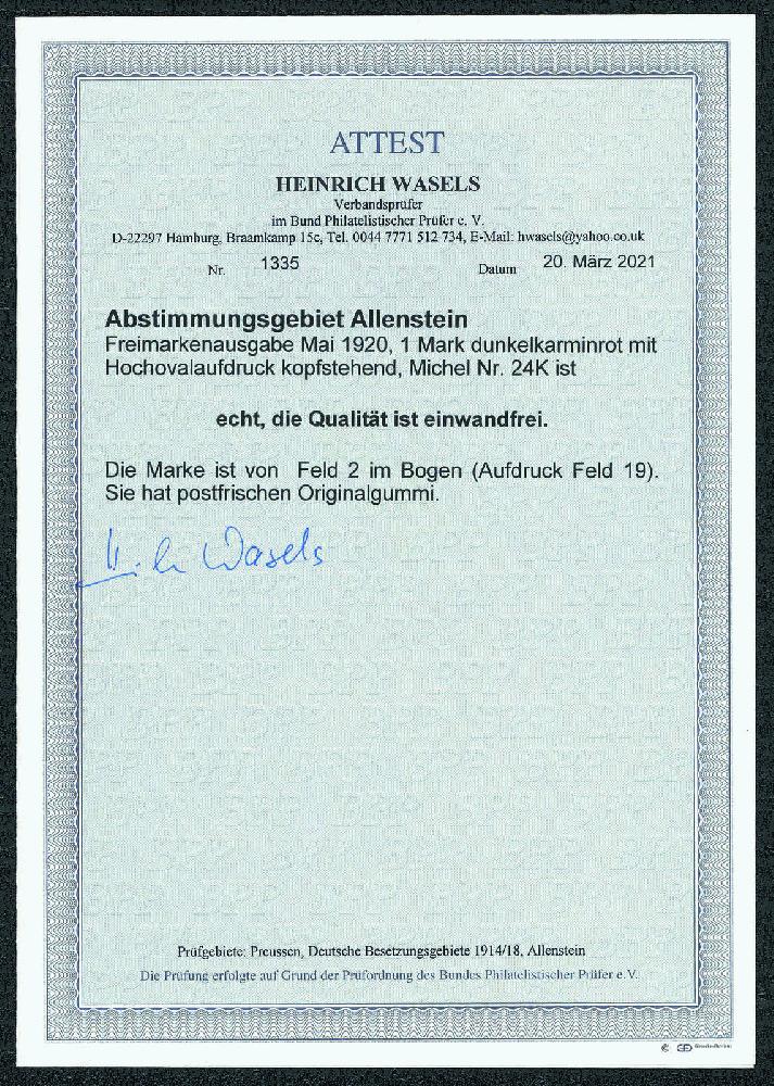 | Zusatzinformationen und Suchstichworte: | Gert Müller 114. Auktion Auktionstermin: 6. April 2022 Los 3118 Allenstein DER KOPFSTEHER VON ALLENSTEIN: 1 Mk. dunkelkarminrot mit extrem seltenem kopfstehendem Aufdruck, farbfrisch und sehr gut gezähnt, tadellos postfr. Eine der großen Abarten-Raritäten dieses Gebietes. Es sind nur wenige Exemplare bekannt geworden und daher aufgrund des fehlenden Angebotes auch im Michel-Spezialkatalog lediglich ohne Preis notiert! Fotoattest "DIE QUALITÄT IST EINWANDFREI" Wasels BPP. Ausruf 2.000,00 EUR |