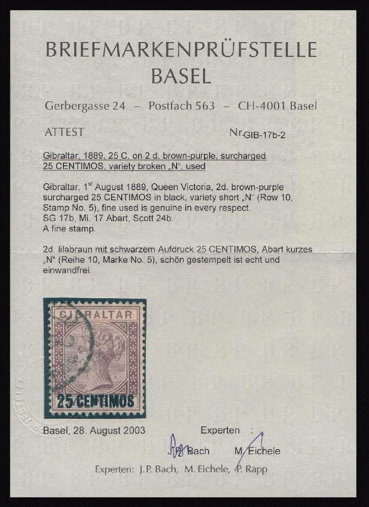 | Zusatzinformationen und Suchstichworte: | 205. Auktionshaus Schulz Auktion 15. - 16. März 2024 Los 4940 Gibraltar 25 C. auf 2 P. lilabraun mit Abart "kurzes n in Centimos" (Reihe 10, Marke 5), gut zentr., sauber gezähnt, farbfrisch Ausruf 40,00 EUR |