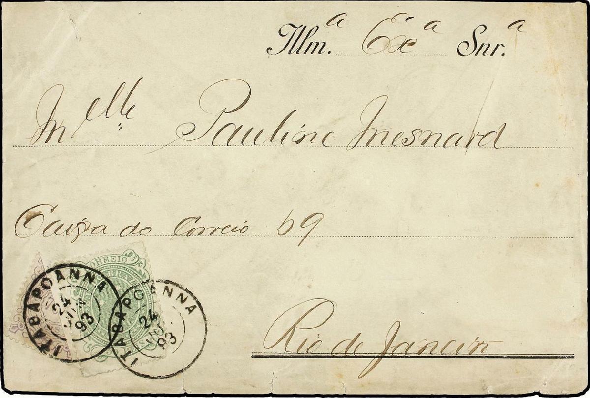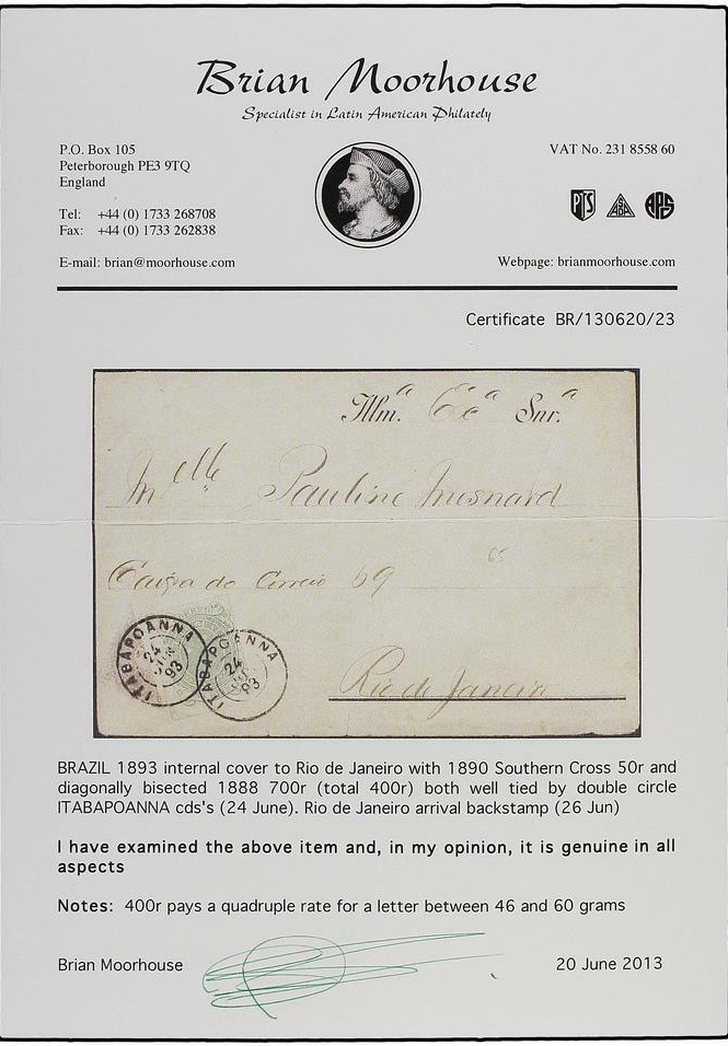 | Zusatzinformationen und Suchstichworte: | Soler y Llach - 799. Auktion - Briefmarken und Belege aus aller Welt 6. Februar 2024 Los 81 Brasilien BRASIL. 1893. ITABAPOANA a RÍO DE JANEIRO. 50 reis verde y 700 reis lila bisectado para ser usado como 350 reis, completando un franqueo de 400 reis equivalente a cuatro portes (peso entre 46 y 60 grms.). Rarísimo, este sello bisectado no está reseñado en Meyer. Posiblemente se trate del único ejemplar conocido Ausruf 400,00 EUR |