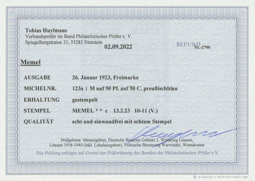 | Zusatzinformationen und Suchstichworte: | Ulrich Felzmann 180. Auktion 14. März 2024 Los 3164 Memel M auf 50 Pfg auf 50 C preußischblau, zeitgerecht gestempelt MEMEL 13.2.23, Pracht Ausruf 240,00 EUR |