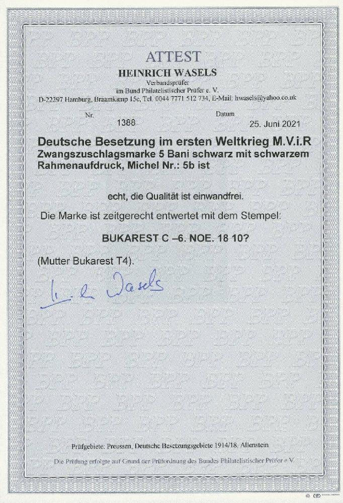 | Zusatzinformationen und Suchstichworte: | Ulrich Felzmann 180. Auktion 14. März 2024 Los 2977 Deutsche Besetzung I. WK Rumänien 5 B schwarz mit schwarzem Aufdruck, zeitgerecht sauber rungestempelt, Fotoattest Wasels BPP "einwandfrei" - Nur in ganz wenigen Exemplaren bekannte Rarität Ausruf 1.500,00 EUR |