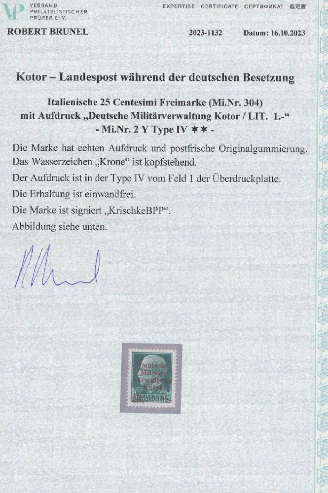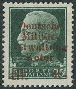 | Zusatzinformationen und Suchstichworte: | Ulrich Felzmann 180. Auktion 14. März 2024 Los 3220 Deutsche Besetzung II. WK Kotor 1 L auf 25 C mit kopfstehendem Wasserzeichen und seltener Aufdrucktype IV (+ 300%), tadellos postfrisch in fehlerfreier Prachterhaltung Ausruf 300,00 EUR |
