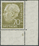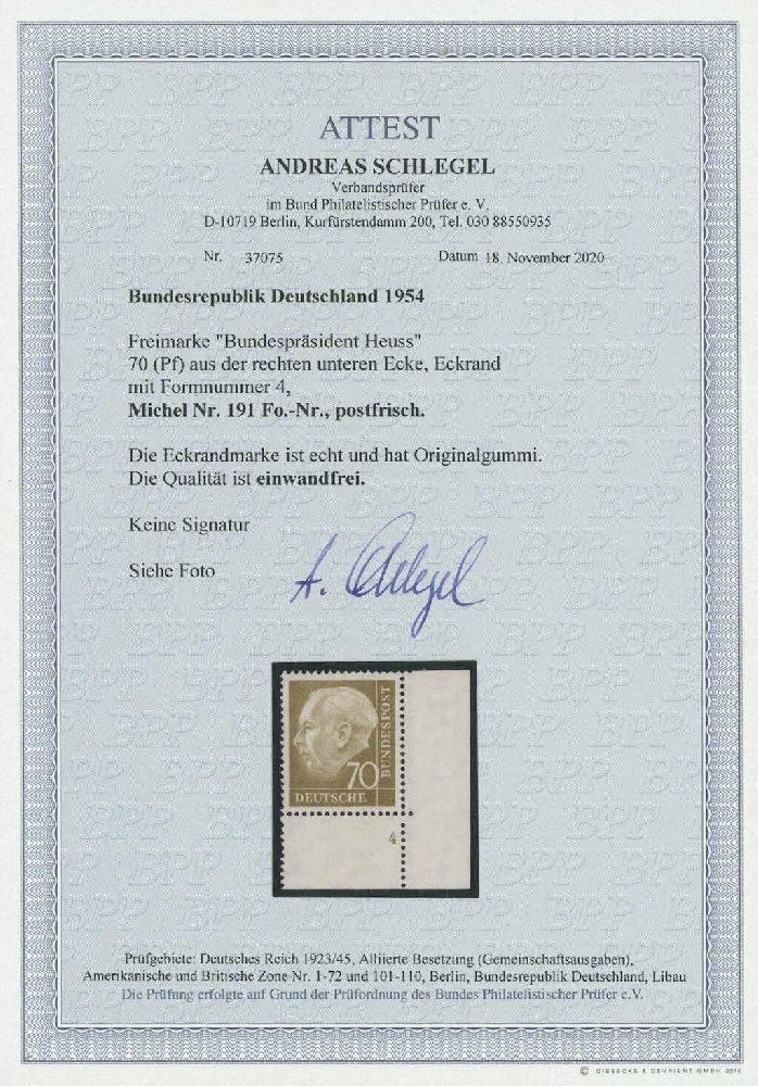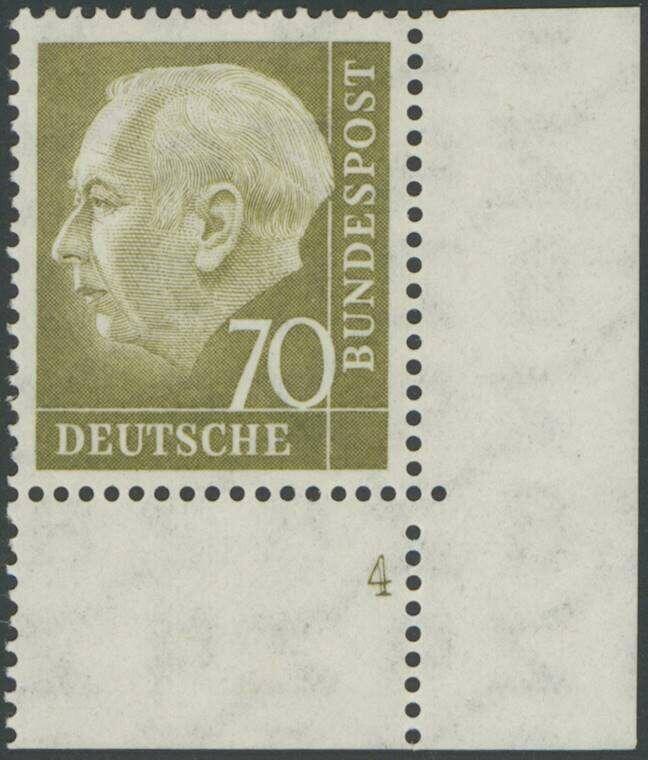 | Zusatzinformationen und Suchstichworte: | Ulrich Felzmann 180. Auktion 14. März 2024 Los 3608 Bundesrepublik Deutschland 70 Pfg Heuss I mit äußerst seltener Formnummer "4", postfrische rechte untere Bogenecke in herausragender, tadellos vollzähniger und ungefalteter Luxuserhaltung, "... einwandfrei" - In dieser Qualität Spitzenstück der ohnehin nur wenigen existenten Exemplare Ausruf 2.000,00 EUR |