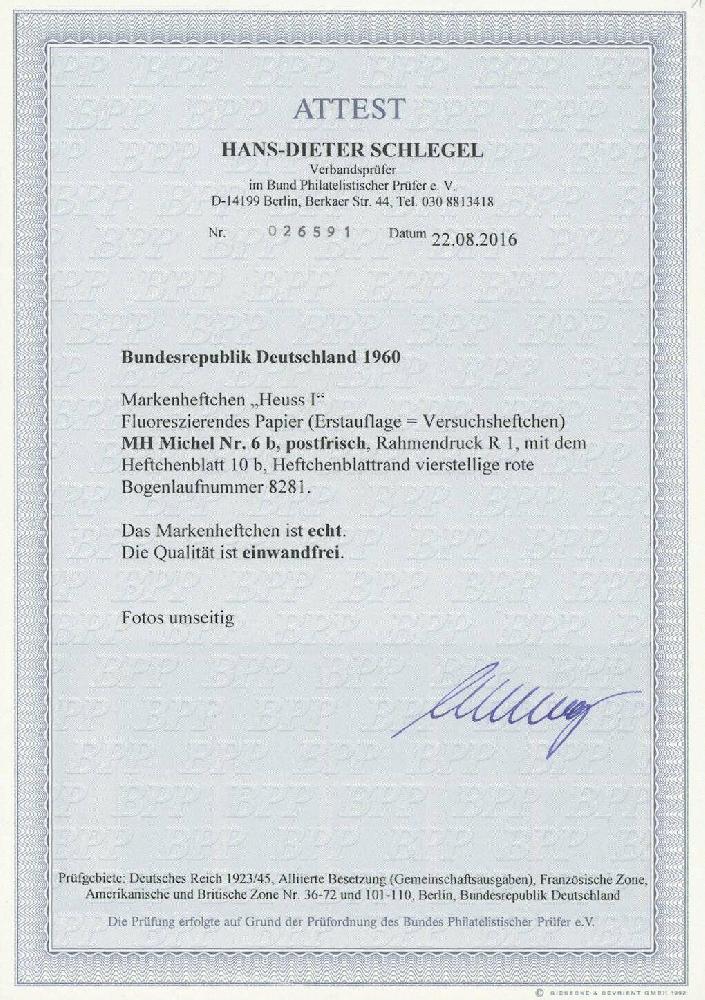 | Zusatzinformationen und Suchstichworte: | Ulrich Felzmann 180. Auktion 14. März 2024 Los 3620 Bundesrepublik Deutschland Heuss lumogen, Versuchsheftchen mit roter Bogenzählnummer 8281 in postfrischer Prachterhaltung Ausruf 400,00 EUR |