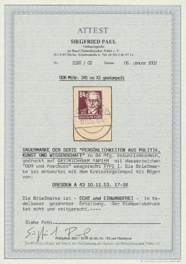 | Zusatzinformationen und Suchstichworte: | Ulrich Felzmann 180. Auktion 14. März 2024 Los 3457 DDR 84 Pfg Bebel mit Wz. 2 X I auf Briefstück, zeitgerecht gestempelt Ausruf 130,00 EUR |