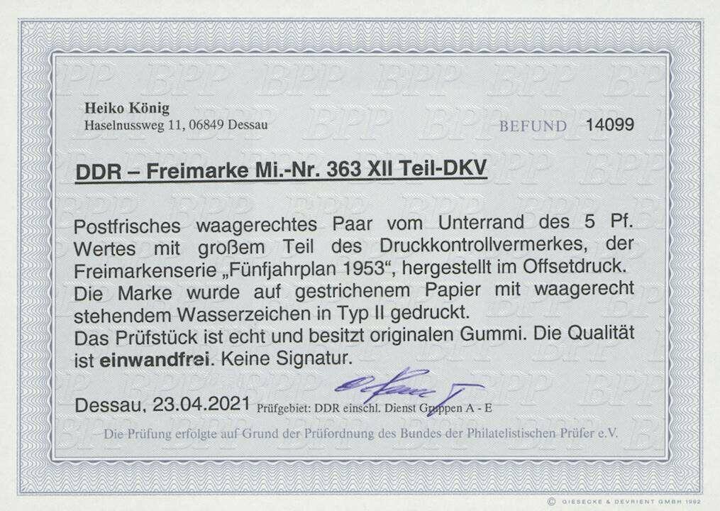 | Zusatzinformationen und Suchstichworte: | Ulrich Felzmann 180. Auktion 14. März 2024 Los 3460 DDR 5 Pfg Fünfjahrplan I mit besserem Wz. 2 XII, waagerechtes Unterrand-Paar mit großem Teil des Druckkontrollvermerkes, postfrisch, Pracht Ausruf 300,00 EUR |