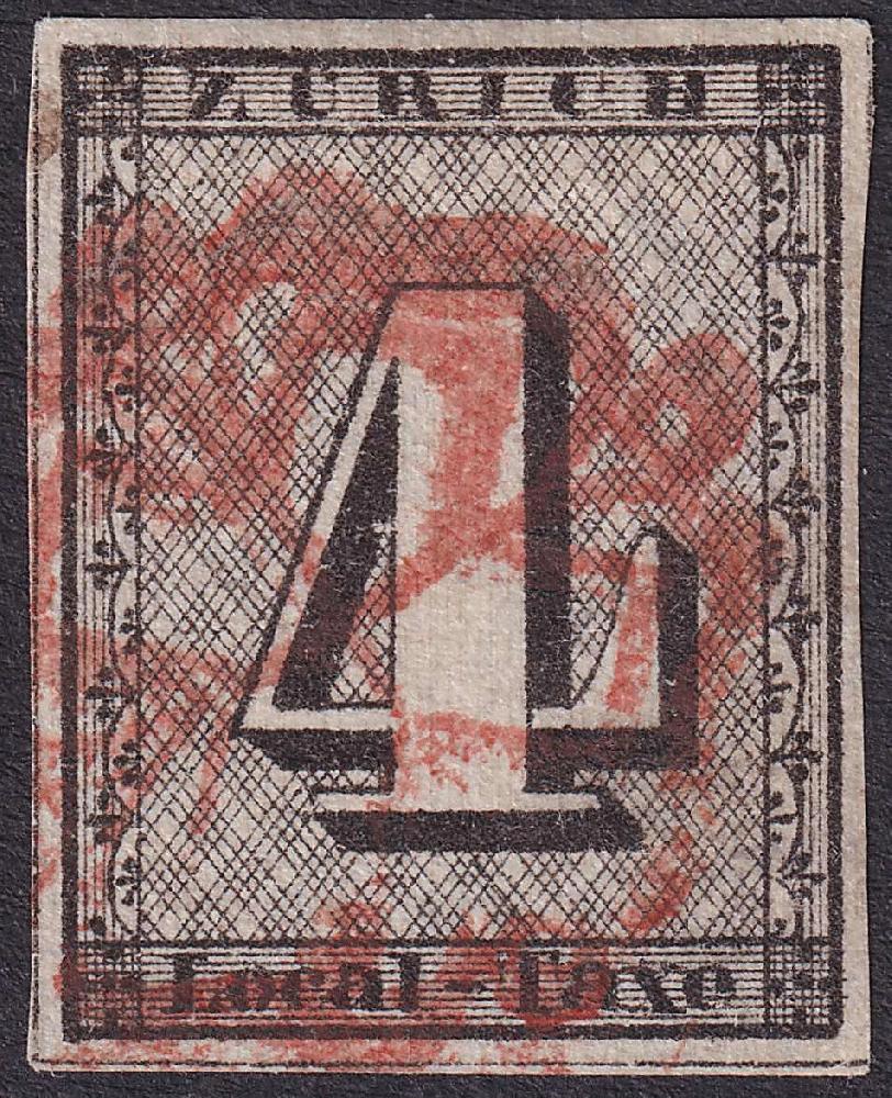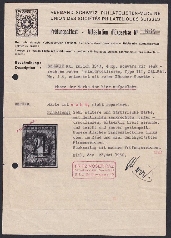 | Zusatzinformationen und Suchstichworte: | Luzernerraute Webshop Los 0000111492 Schweiz Kanton Zürich ZÜRICH 4, Type III. Breitrandige, fehlerfreie Marke Nr.1S (senkrechte Unterdruck-Linien) besonders frisch wirkend und mit roter Rosette entwertet, |