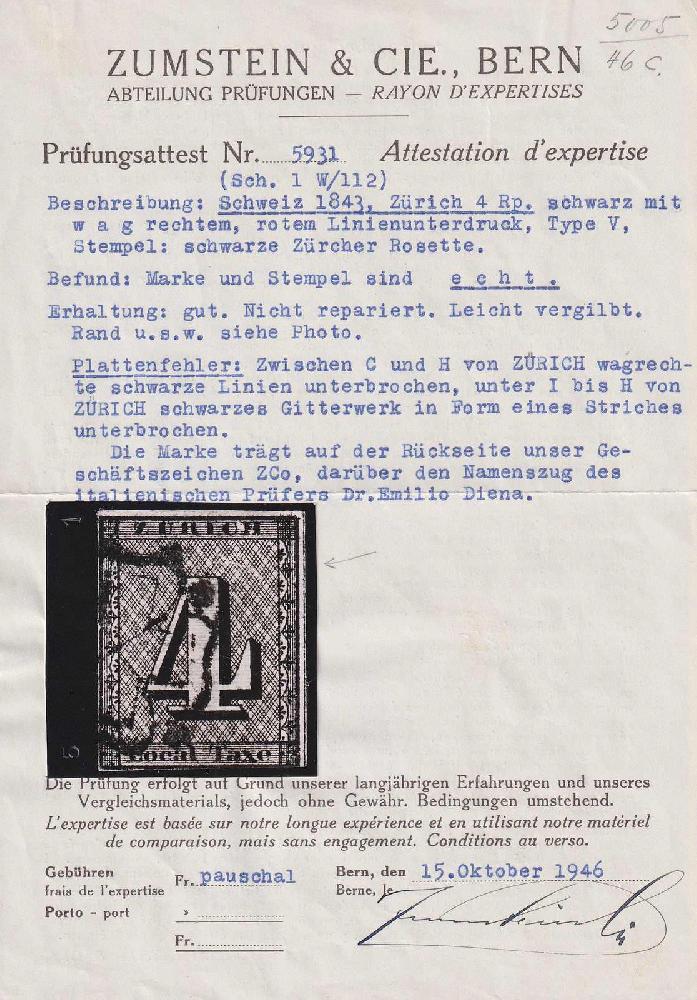| Zusatzinformationen und Suchstichworte: | Luzernerraute Webshop Los 0000104422 Schweiz Kanton Zürich ZÜRICH 4, gestempelt mit schwarzer Rosette, waagrechte Unterdurck-Linien, mit Plattenfehler: farblose Stelle zwischen C und H. Ebenfalls Plattenfehler im Netzwerk: farbloser Strich im oberen Bereich. Sehr schönes Stück mit Attesten Zumstein (1946) Eichele (2022), SBK: 32'000.-+10% für Stempel + 2x 3'000.- für Plattenfehler. Spektakuläre Kantonalmarke mit sauberer Entwertung und gutem bis meist breiten Schnitt! Bestens ebenfalls geeignet für eine Plattierung, da die Feldmarkmale bestens ausgeprägt sind. Abartenkombination macht das Stück aussergewöhnlich! Festpreis 19.500,00 CHF |