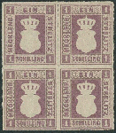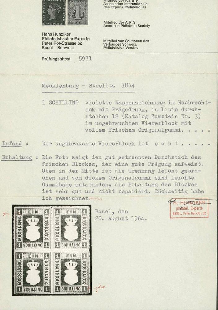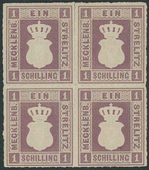 | Zusatzinformationen und Suchstichworte: | Ulrich Felzmann 180. Auktion 14. März 2024 Los 2654 Altdeutschland Mecklenburg Strelitz 1 S grauviolett im Kabinett-Viererblock, farbfrisch und allseits tadellos durchstochen, oben die mittlere Trennung unbedeutend gebrochen, Einheiten dieser Marke sind selten Ausruf 700,00 EUR |