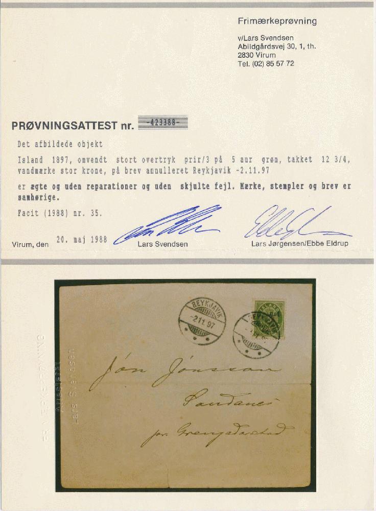 | Zusatzinformationen und Suchstichworte: | Postiljonen 240. & 241. Int. Briefmarken Auktion 19. - 22. März 2024 Los 1045 Island Prir Ausgabe Inverted overprints 3/5 large "prir" green on commercial letter from "REYKJAVIK 2.11 97" sent to "GRENJADARSTADIR 24.11" (arrival mark on the reverse) Ausruf 250,00 EUR |