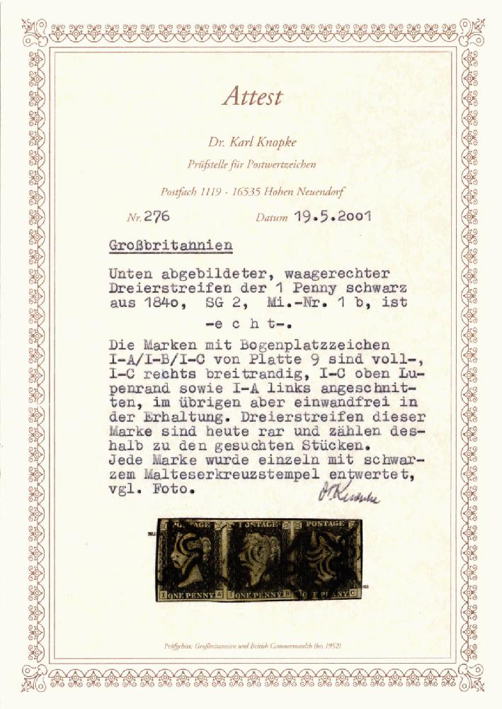 | Zusatzinformationen und Suchstichworte: | 76. Hadersbeck Auktion 16. - 17. April 2024 Los 796 Grossbritannien 1840 1d schwarz 1840, 1 P. schwarz, Platte 9, waag. 3er-Streifen, rechts angeschnitten, sonst breit-/vollrandig, jeder Wert mit schwarzem Malteserkreuz-St., sehr selten Ausruf 500,00 EUR |