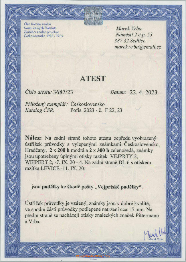 | Zusatzinformationen und Suchstichworte: | Burda 74. Auktion 9. -10. März 2024 Los 1928 Tschechoslowakei 1918-1939 1920 VEJPRTSKE Fälschung/Vortrennschnitt Paket dispatch-note freigemacht mit. 4 Briefmarken vejprtskych Fälschungen (!) 2x Pof. F22 und 2x F23,200h blau und 300h grün, volles Abdruck Stempel. VEJPRTY 2/7. IX. 20; insgesamt sehr schöne Qualität, in niedriger Teil mit kleinem geklebten herausreißend von stmp |