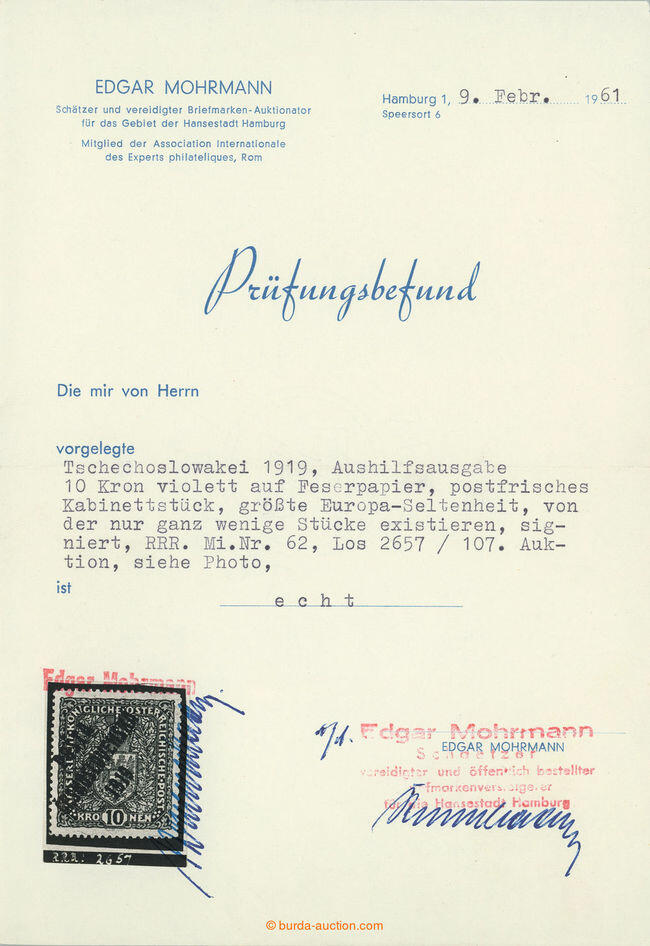 | Zusatzinformationen und Suchstichworte: | Burda 74. Auktion 9. -10. März 2024 Los 2209 Tschechoslowakei 1918-1939 Wappen 10 K auf Faserpapier/Pof. 51b II, Wappen 10K lebhaftviolett auf Faserpapier, breitformatiger, Aufdruck-Type II; äußerst selten Briefmarke in ausgezeichneter Qualität, kleiner Falz, perforationect Staat von Zähnung usw. eine der seltensten tschechoslovakischen Briefmarke, nur einige Belege bekannt Zuschlag 63.265,00 EUR |