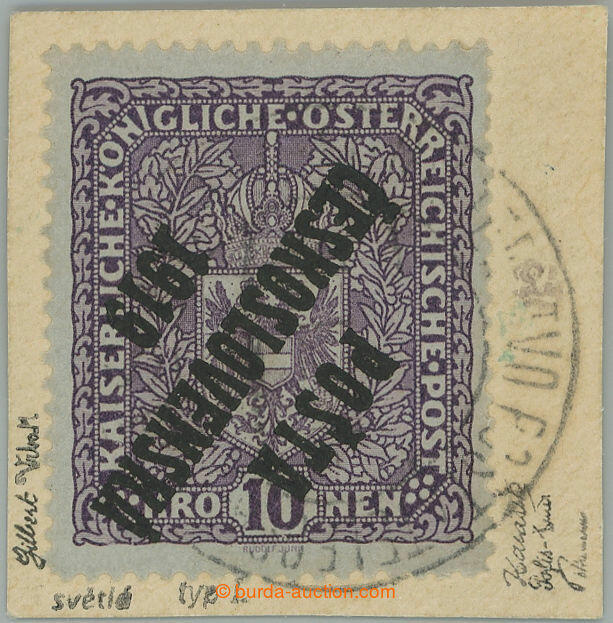 | Zusatzinformationen und Suchstichworte: | Burda 74. Auktion 9. -10. März 2024 Los 2199 Tschechoslowakei 1918-1939 Kopfstehender Aufdruck/Pof. 51I Pp, Wappen 10K hellviolett mit kopfstehendem Aufdruck, I. Type auf kleinen cut-square mit Kreisdatumsstempel MINISTERSTVO POST ein Telegramm? Zuschlag 1.633,00 EUR |