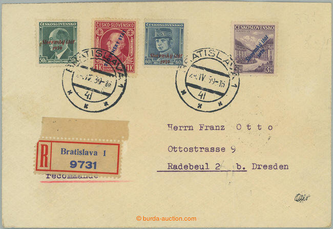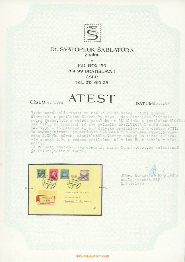 | Zusatzinformationen und Suchstichworte: | Burda 74. Auktion 9. -10. März 2024 Los 2788 Slowakei 1939-45 1939 Einschreiben adressiert an nach Deutschland mit gemischte frankturou stmp mit Überdruck. I. Ein. Stefanik 60h blau und Slavkov 3,50CZK mit blauer Aufdruck Sy. 19b (nach Gültigkeit), Kreisdatumsstempel BRATISLAVA 1/24. IV. 39, auf der Rückseite Ankunftstempel RADEBEUL 2/27,4,39; gute Erhaltung Zuschlag 82,00 EUR |