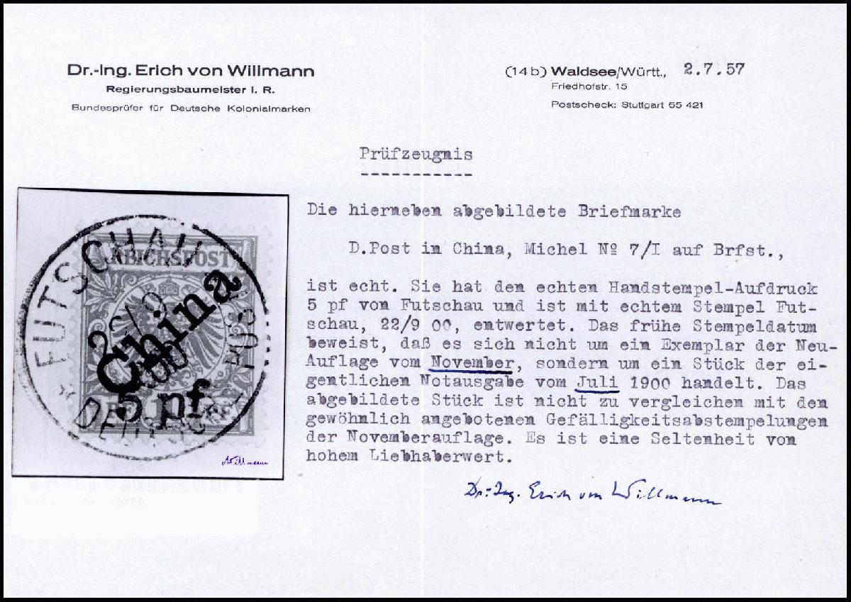 | Zusatzinformationen und Suchstichworte: | Württembergisches Auktionshaus - Spezialauktion Deutsche Post in China 6. April 2024 Los 121 Deutsche Auslandspost China 5 pf. a. 10 Pfg., Futschau-Provisorium, Erstauflage, tadelloses Briefstück mit besonders schönem Stempel FUTSCHAU 22/9 00. Eines der besten bekannten Exemplare dieser seltenen ersten Auflage mit Stempeldatum vor Anfang November 1900 (Auflage ledigl. 100 Exemplare) Ausruf 1.800,00 EUR |