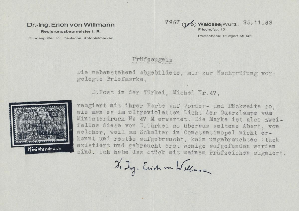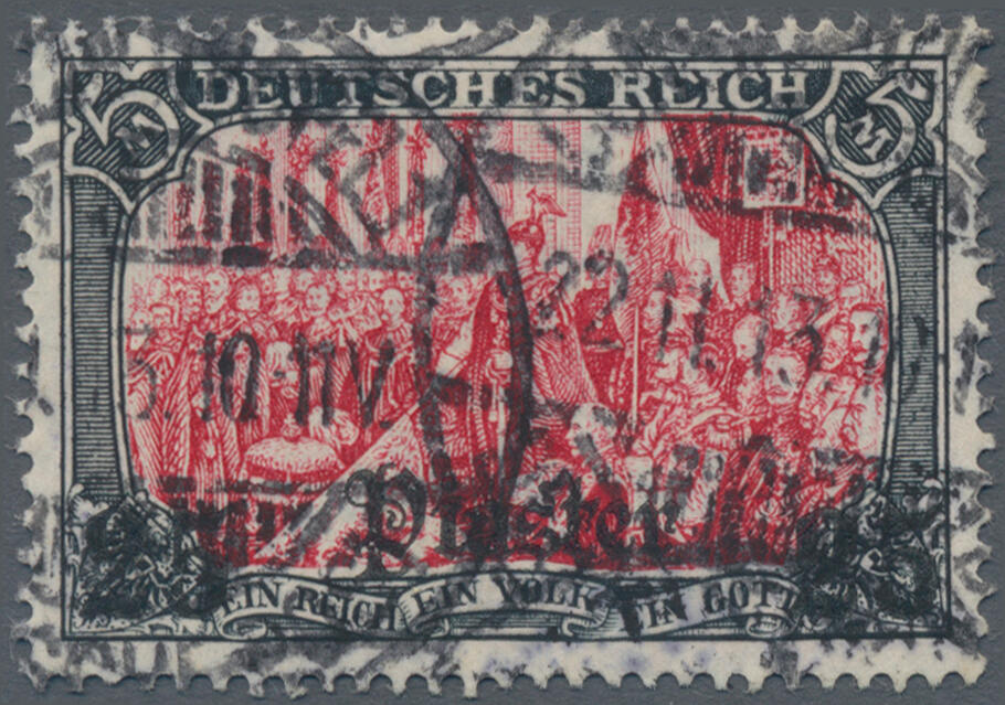 | Zusatzinformationen und Suchstichworte: | Christoph Gärtner 58. Auktion 19. - 23. Februar 2024 Los 5484 D Deutsche Auslandspost Türkei 1905, Reichsgründungsfeier: 5 Mark mit Wz. 1, überdruckt mit "25 Piaster", schwarz/ dunkelkarmin. Sogenannter MINISTERDRUCK, der Rahmen quarzt dunkelgelbocker, entwertet "CONSTANTINOPEL 22.11.13 10-11V.". Farbfrisch, gut gezähnt in fehlerfreier, gebrauchter Erhaltung. Einwandfrei erhaltene Stücke sind sehr selten, da die meisten Belegstücke auf Paketkarten verwendet wurden und entsprechende bedarfsbedingte Einschränkungen zeigen Zuschlag 1.350,00 EUR |