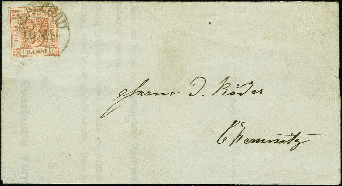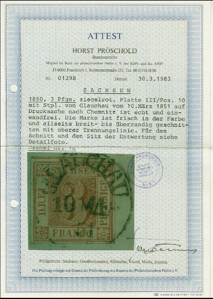 | Zusatzinformationen und Suchstichworte: | 383. Auktion Heinrich Köhler 14.–15. & 18.–23. März 2024 Los 3957 Altdeutschland Sachsen 3 Pfg. lebhaftrot, Platte III, Pos. 10, farbfrisch und allseits breitrandig, oben mit Zwischenlinie, mit sauber aufgesetztem EKr. "GLAUCHAU 10 MAE 51" auf kompletter Drucksache (Vertreterankündigung für Brieftaschen, Zigaretten-Etuis, etc.), rückseitig versiegelt und adressiert nach Chemnitz. Ein sehr attraktives und interessantes Stück; aufgrund der Versiegelung hätte die Drucksache taxiert werden müssen. Schöne und einwandfreie Erhaltung (die Drucksache am rechten Rand minimal fehlerhaft). Ausruf 8.000,00 EUR |