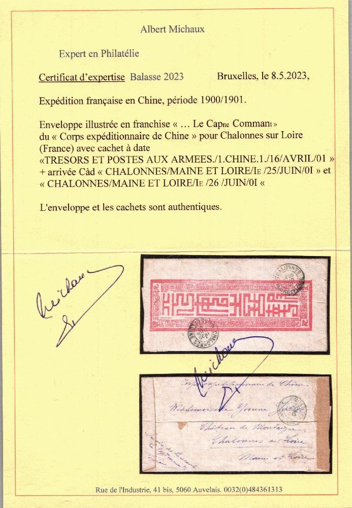 | Zusatzinformationen und Suchstichworte: | Baratoux Bordeaux - Philatelie und Postkarten 15. Januar 2024 Los 342 China Französische Post Chine - China 1901: Expédition française en Chine, belle enveloppe illustrée en franchise pour Chalonnes sur Loire, avec cachet trésors et postes aux armées - Chine et càd + certificat photo - SUP - Ausruf 200,00 EUR |