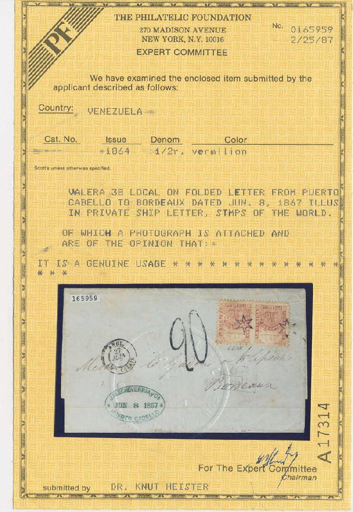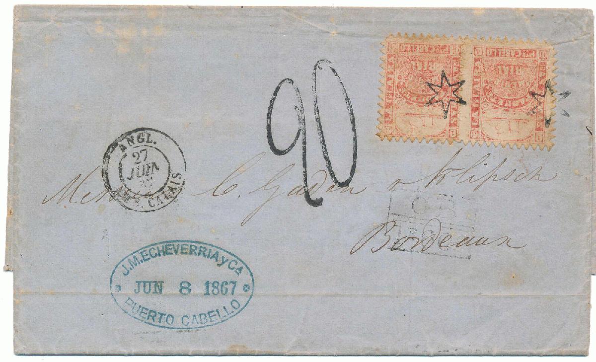 | Zusatzinformationen und Suchstichworte: | Postiljonen 240. & 241. Int. Briefmarken Auktion 19. - 22. März 2024 Los 870 Dänisch Westindien Cover with Pair Medio Real Sent from Puerto Cabello via "LONDON JU 27 67" and "PARIS Á BORDEAUX 27 JUIN 67" to "BORDEAUX JUIN 28 67". Blue oval sender's cachet "PUERTO CABELLO JUN 8 1867". French due mark "20" (centimes, postage due) and postage separation mark "GB 1F60c". Blue star figure postmarks. A very rare and possibly unique cover, illustrated in Ringström/Tester part 1, p.103. Ausruf 2.500,00 EUR |