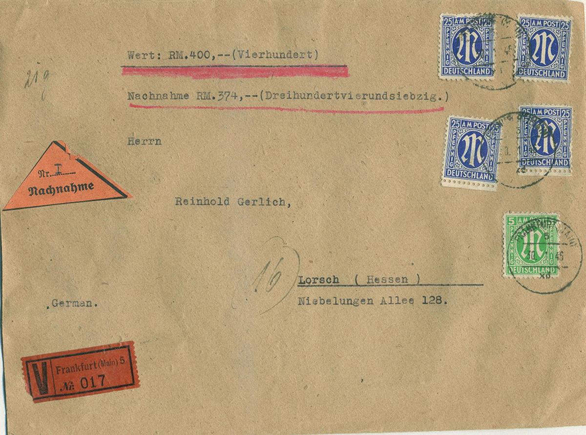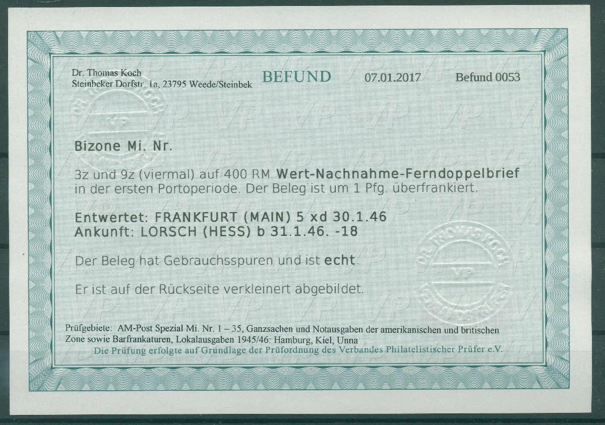 | Zusatzinformationen und Suchstichworte: | Ralf Krenz Webshop Los 920714 Bizone 5Pfg. und 25Pfg.(4) amerikanischer Druck 1945, als Mischfrankatur auf portogerechtem Wert-Nachnahme-Ferndoppelbrief (1Pfg. überfrankiert), Festpreis 150,00 EUR |