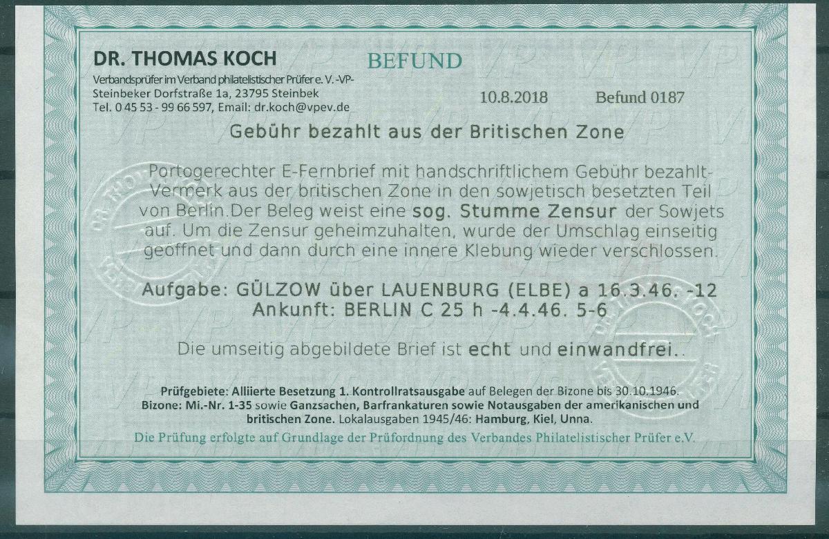 | Zusatzinformationen und Suchstichworte: | Ralf Krenz Webshop Los 920723 Bizone Gebühr bezahlt aus der Britischen Zone, portogerechter E-Fernbrief mit sog. stummer Zensur Festpreis 40,00 EUR |