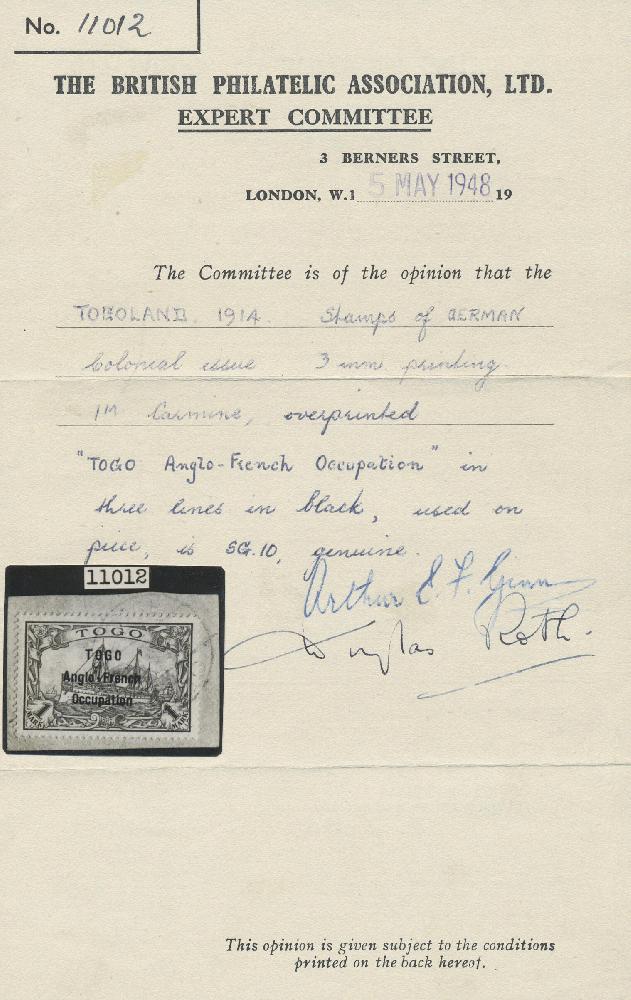 | Prüfgebiet: | Deutsche Kolonien Togo Britische Besetzung |