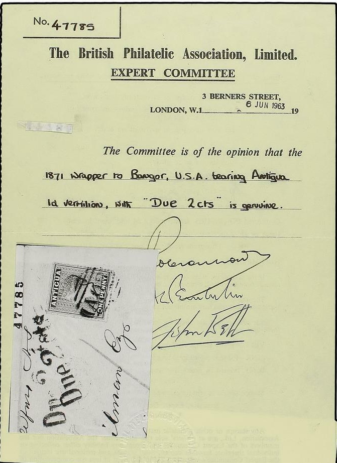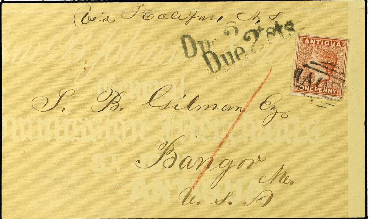 | Zusatzinformationen und Suchstichworte: | Soler y Llach - 799. Auktion - Briefmarken und Belege aus aller Welt 6. Februar 2024 Los 538 Antigua und Antigua Barbuda ANTIGUA. 1871 (April 27). Bedruckter Umschlag (Anschrift des Absenders) ab Antigua über Halifax, Neuschottland nach Bangor, USA mit 1867 1 d. zinnober entwertet mit ´AO2´ Stempel in schwarz, rot handschriftlich ´1´ in Pastell. Gestempelt mit Einzeiler ´Due 2 cts. ´ in schwarz bei der Ankunft Ausruf 300,00 EUR |