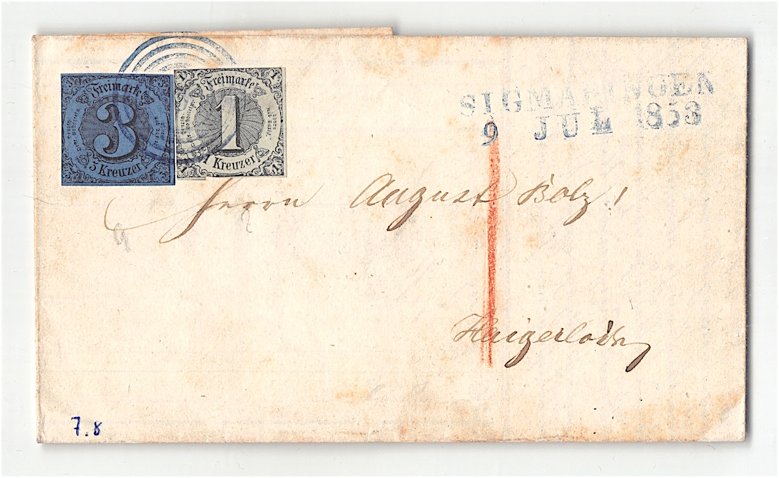 | Zusatzinformationen und Suchstichworte: | Alexander Voigt Briefmarkenhandel Los 0000102472 Altdeutschland Thurn und Taxis "306" SIGMARINGEN - HAIGERLOCH: 1 Kr. olivgrau und 3 Kr. schwarz auf blau "Ziffern", Taxisschnitt, mit SELTENEM BLAUEN Nummernstempel "306", nebengesetztem blauen L2 "SIGMARINGEN, 9 JUL 1853" und rotem Bestellgeld-Vermerk "1" auf Brief an Herrn August Bolz in Haigerloch. Rückseitig nachverwendeter Vorphila-Steigbügelstempel "HAIGERLOCH, 11 JUL 1853" (Feuser 205). Fotobefund Sem BPP: "Das Prüfstück ist echt und tarifgerecht freigemacht. [...] Taxisschnitt.". Unsigniert. Festpreis 400,00 EUR |