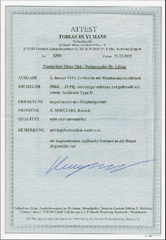 | Prüfgebiet: | Deutsche Besetzung WK 1 Postgebiet Ober Ost Libau |