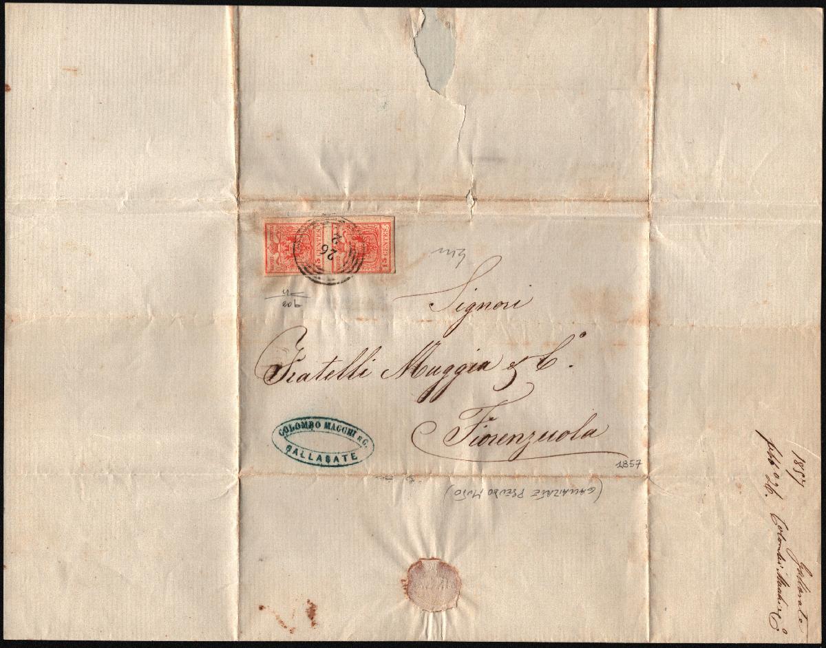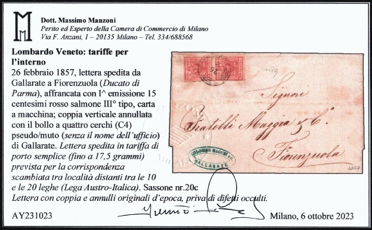 | Zusatzinformationen und Suchstichworte: | Versuch einer Übersetzung: Lombardei Venetien: interne Tarife 26. Februar 1857, Brief von Gallarate nach Fiorenzuola (Herzogtum Parma), frankiert mit 1. Ausgabe 15 Cent lachsrot 3. Type, Maschinpapier; Vertikales Paar, entwertet mit dem Pseudo-/Stumm-Vierkreisstempel (C4) (ohne den Namen des Amts) von Gallarate. Der Brief wird zum einfachen Portotarif (bis zu 17,5 Gramm) versandt und ist für den Korrespondenzaustausch zwischen Orten im Umkreis von 10 bis 20 Meilen erforderlich (Österreichisch-Italienische Meile). Sassone Nr.20c Brief mit originalem Paar und Stempeln, frei von versteckten Mängeln. |
