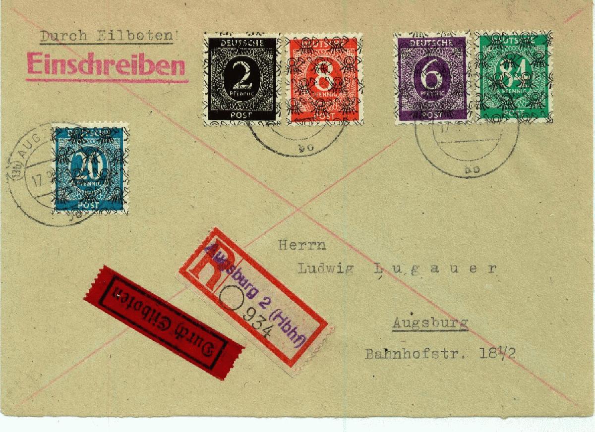 | Zusatzinformationen und Suchstichworte: | www.philaseiten.de Eil-Einschreiben-Brief innerhalb von Augsburg zwei Tage vor Ablauf der Gültigkeit am 19.09.1948. Bei einem Teil der Marken handelt es sich um Aufdruckfälschungen - zunächst zum Schaden der Post |