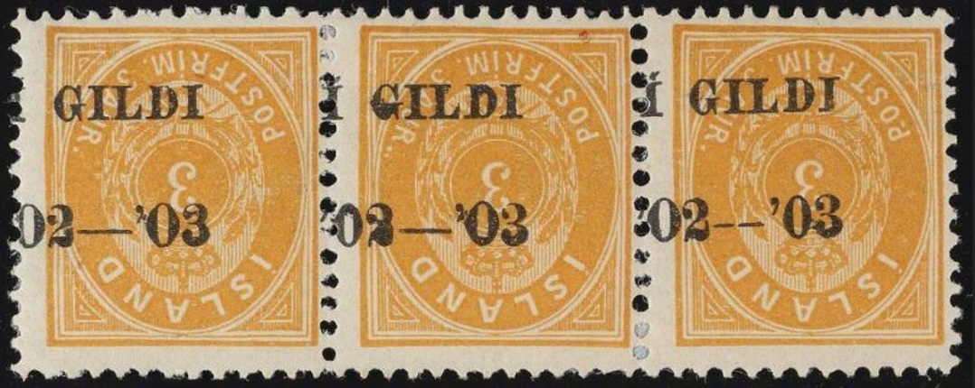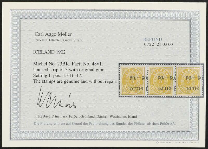 | Zusatzinformationen und Suchstichworte: | Ein ungebrauchter Dreierstreifen dieses Kopfstehers mit Befund wurde an der Bruun Rasmussen Auktion vom 7. April 2024 in Kongens Lyngby/Dänemark unter Los 4465 für 2‘200 DKK (ca. 300 €) + Aufgeld verkauft. |