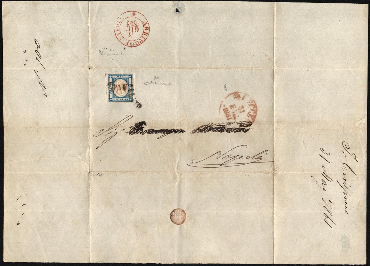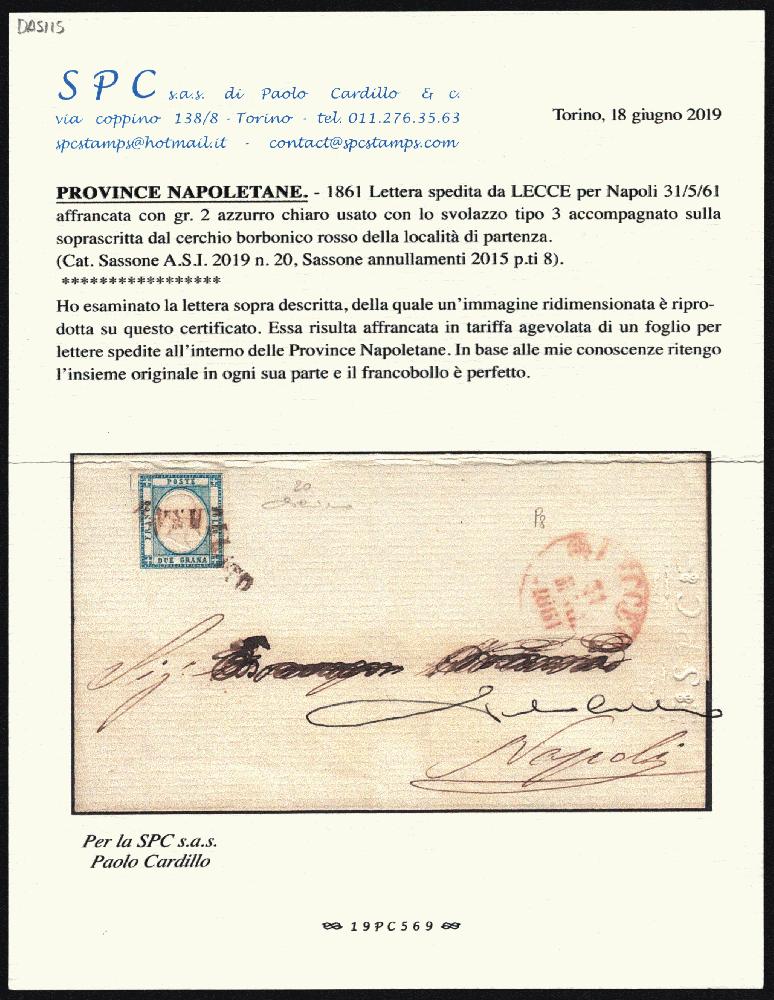 | Zusatzinformationen und Suchstichworte: | Versuch einer Übersetzung: NEAPOLITANISCHE PROVINZEN. 1861 Brief von LECCE nach Neapel 31.5.61, frankiert mit 2 Grana hellblau mit dem Typ-3-Schnörkel, begleitet von dem roten Bourbon-Kreis des Abgangsortes. (Kat. Sassone A.S.I. 2019 Nr. 20, Sassone-Stempel 2015 Punkte 8). Ich habe den oben beschriebenen Brief geprüft, dessen verkleinertes Bild auf diesem Zertifikat wiedergegeben ist. Frankiert für Briefe, die innerhalb der neapolitanischen Provinzen verschickt werden, zu einem ermäßigten Preis von einem Blatt. Aufgrund meines Wissens halte ich das Set in allen Teilen für original und die Marke ist perfekt. |