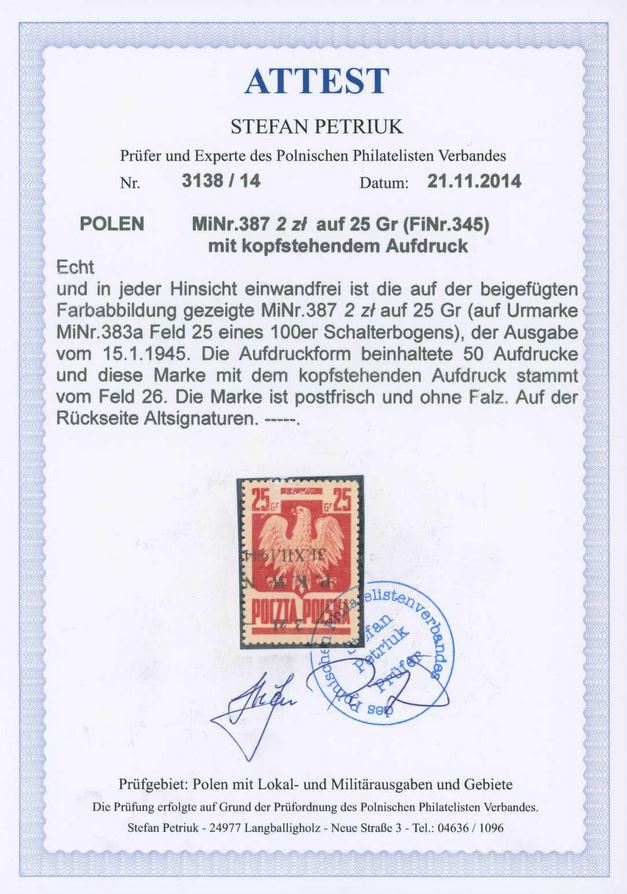 | Prüfer: | Petriuk, Stefan (PZF (Poln. Philatelisten-Verband - Polski Związek Filatel.)) |