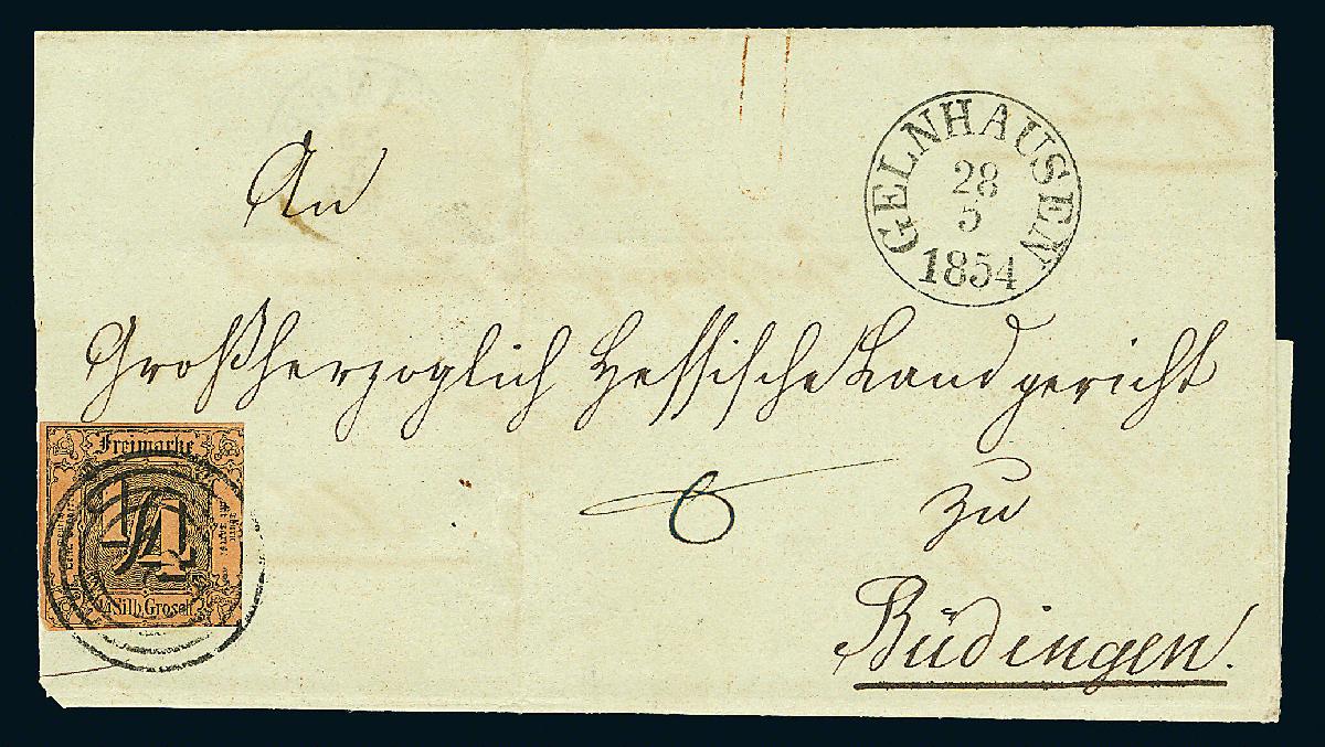 | Zusatzinformationen und Suchstichworte: | Dr. Derichs 177. Auktion 21. - 22. Juni 2024 Los 500 Altdeutschland Thurn und Taxis \BESTELLGELDFRANKATUR\: 1/4 Sgr. schw./rotbraun, teils vollrandiger Taxisschnitt, auf doppelt verwendetem portofreien Brief mit Nummernstempel "24" und Aufgabe-K1 "Gelnhausen 28.5.1854" nach Büdingen. Ein rückseitiges Papiersiegel ist nicht zugehörig. Als Dienstbrief war der Brief an sich portofrei und die Marke deckt nur das im voraus bezahlte Bestellgeld ab. Fotoattest Sem BPP: "Laut zugehöriger Marke und ursprünglicher Taxierung handelt es sich um einen portofreien Brief mit vorfrankiertem Bestellgeld... Ein seltener Beleg in sauberer Erhaltung.". (Michel 1.700.-) Ausruf 200,00 EUR |