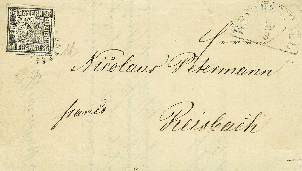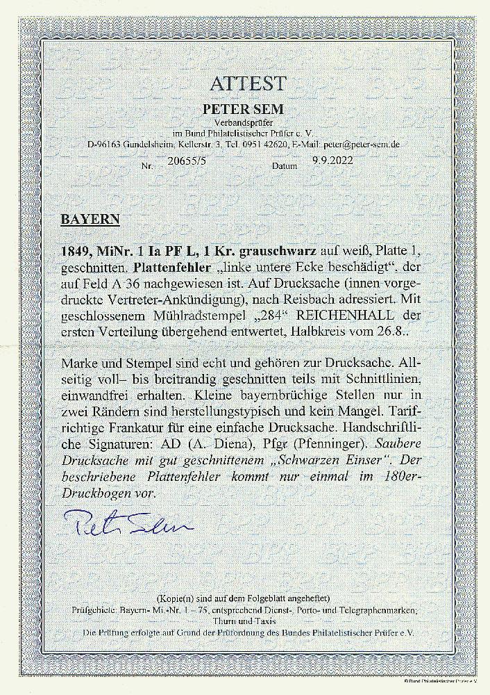 | Zusatzinformationen und Suchstichworte: | Dr. Derichs 177. Auktion 21. - 22. Juni 2024 Los 1048 Altdeutschland Bayern 1 Kr. grauschwarz, Platte 1, Plattenfehler "linke untere Ecke beschädigt" (Bogenfeld A36), vierseitig voll- bis breitrandig auf vollständiger Drucksache (Vertreterankündigung) mit geschlossenem Mühlradstempel "284" und Halbkreis-Nebenstempel "Reichenhall 26/8" nach Reisbach. Kabinett. Zwei kleine bayernbrüchige Stellen nur im Bogenrand außerhalb des Markenbildes sind herstellungstypisch und kein Mangel. Ein schönes Ganzstück der ersten Deutschen Briefmarke. Neues Fotoattest Sem BPP: "einwandfrei erhalten... Der beschriebene Plattenfehler kommt nur einmal im 180er-Druckbogen vor.". (Michel 7.000.-++, dabei ist der Plattenfehler noch nicht berücksichtigt. In Anbetracht der Tatsache, daß dieser auf 180 Marken nur einmal vorkommt, ist hier ein deutlicher Aufschlag erforderlich.). Ausruf 3.800,00 EUR |