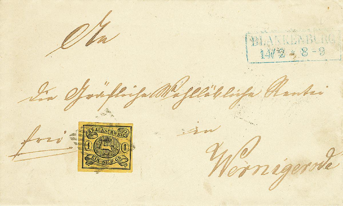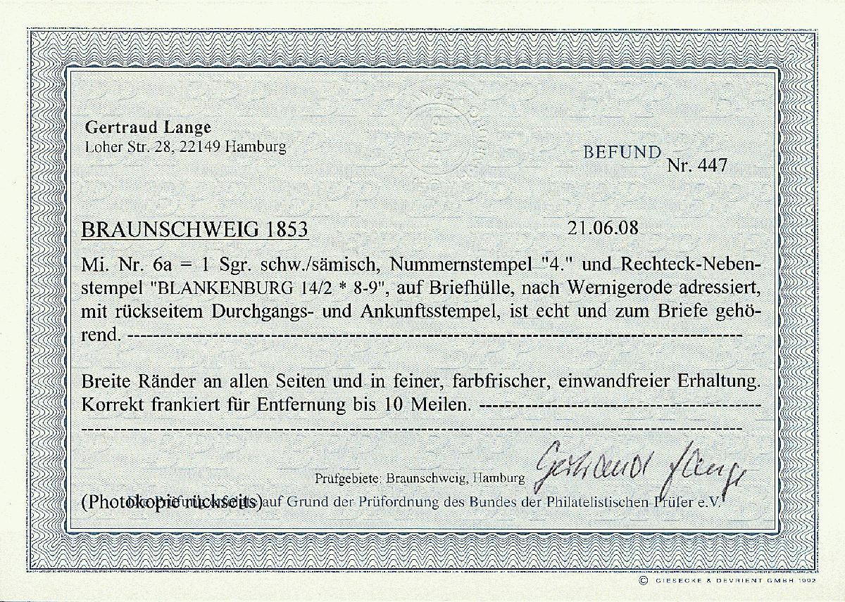 | Zusatzinformationen und Suchstichworte: | Dr. Derichs 177. Auktion 21. - 22. Juni 2024 Los 1120 Altdeutschland Braunschweig "4." in Schwarz und blauer Aufgabe-Ra2 "Blankenburg 14/2" auf Brief mit voll- bis breitrandiger 1 Sgr. schw./sämisch in den Postverein nach Wernigerode/Königreich Preußen mit rückseitigem Ausgabe-Stempel und Preußen-Ra2 "Halberstadt 14/2" als Grenzübergangsstempel. Kabinett. Fotobefund Lange BPP: "in feiner, farbfrischer, einwandfreier Erhaltung". (Michel 200.- zzgl. Handbuch 40.- für den Stempel = 240.-) Ausruf 100,00 EUR |