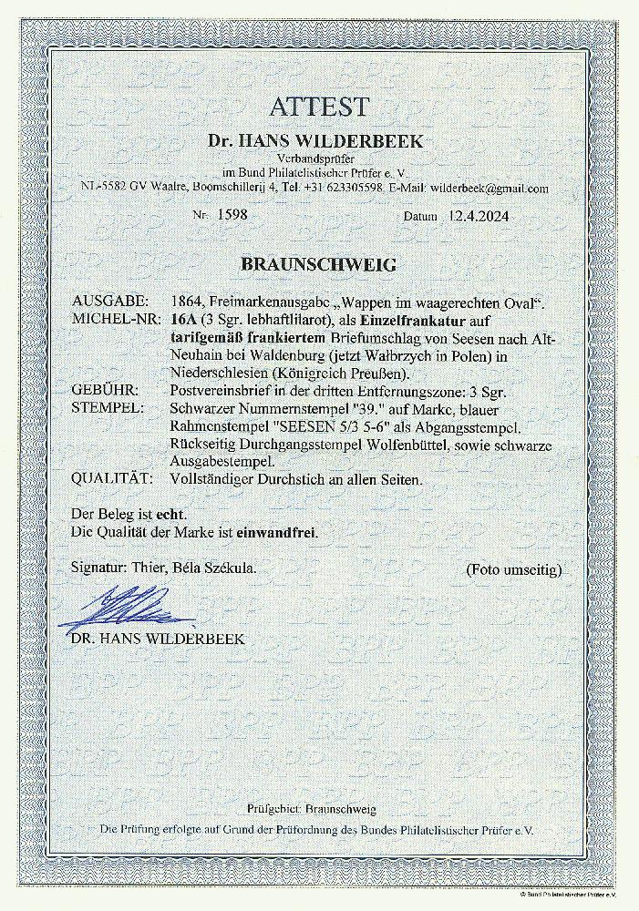 | Zusatzinformationen und Suchstichworte: | Dr. Derichs 177. Auktion 21. - 22. Juni 2024 Los 1140 Altdeutschland Braunschweig 3 Sgr. lebhaftlilarot, bogenförmig durchstochen, Einzelfrankatur auf Luxusbrief mit schwarzem Nummernstempel "39." und blauem Aufgabe-Ra2 "Seesen 5/3" nach Alt-Neuhain bei Waldenburg in Niederschlesien/Königreich Preußen. Fotoattest Brettl BPP und neues Fotoattest Dr. Wilderbeek BPP: "Die Qualität der Marke ist einwandfrei.". (Michel 1.400.-). Anmerkung: Ein schöner Postvereinsbrief in den heute in Polen liegenden Ort mit heutigem Ortsnamen Walbrzych. Ausruf 500,00 EUR |