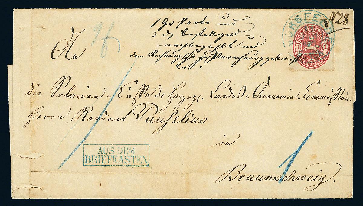 | Zusatzinformationen und Suchstichworte: | Dr. Derichs 177. Auktion 21. - 22. Juni 2024 Los 1142 Altdeutschland Braunschweig 1 Gr. karminrot, vollständiger Durchstich an allen Seiten (linke untere Ecke verbessert, sonst einwandfrei) auf Brief mit blauem K2 "Vorsfelde 11 Jan.1867" nach Braunschweig, nebengesetzt blauer Ra2 "AUS DEM BRIEFKASTEN". Der Brief entsprach der zweiten Gewichtsstufe, ist aber nur für die erste Gewichtsstufe frankiert. Mit interessantem handschriftlichen Briefträger-Vermerk auf der Vorderseite und Blaustift-Taxvermerken. Ein in dieser Form ganz und gar ungewöhnlicher Brief. Ausruf 250,00 EUR |