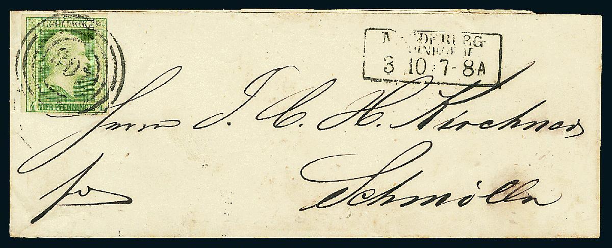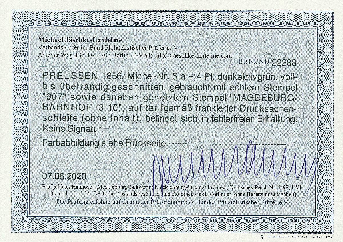 | Zusatzinformationen und Suchstichworte: | Dr. Derichs 177. Auktion 21. - 22. Juni 2024 Los 1249 Altdeutschland Preussen 4 Pfg. grün, vierseitig voll- bis breitrandig bzw. links sogar mit Ansatz der Nachbarmarke als Einzelfrankatur auf vollständiger Streifbandschleife mit Nummernstempel "907" und Aufgabe-Ra3 "Magdeburg Bahnhof 3/10" nach Schmölln/Königreich Sachsen. Luxus. Neuer Fotobefund Jäschke-Lantelme BPP: "in fehlerfreier Erhaltung". Ausruf 150,00 EUR |