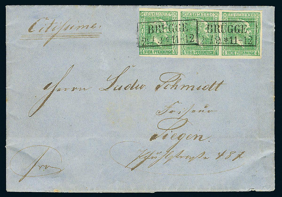 | Zusatzinformationen und Suchstichworte: | Dr. Derichs 177. Auktion 21. - 22. Juni 2024 Los 1258 Altdeutschland Preussen 4 Pfg. grün, waagerechter Dreierstreifen, vierseitig voll- bis breitrandig und in frischer Farbe mit zwei ideal aufgesetzten Ra2 "Brügge 29/9" nach Siegen. Kabinett. Links oben mit dreifach unterstrichenem Vermerk "Citissime", der keine postalische Bedeutung hat, sondern nur die Bitte des Absenders an die Post für eine schnelle Beförderung zum Ausdruck bringt. Ein seltener und ausgesprochen attraktiver Brief dieses kleinen Ortes aus der Preußischen Westfalenprovinz. Neues Fotoattest Jäschke-Lantelme BPP: "in fehlerfreier, gebrauchter Erhaltung". Ausruf 400,00 EUR |