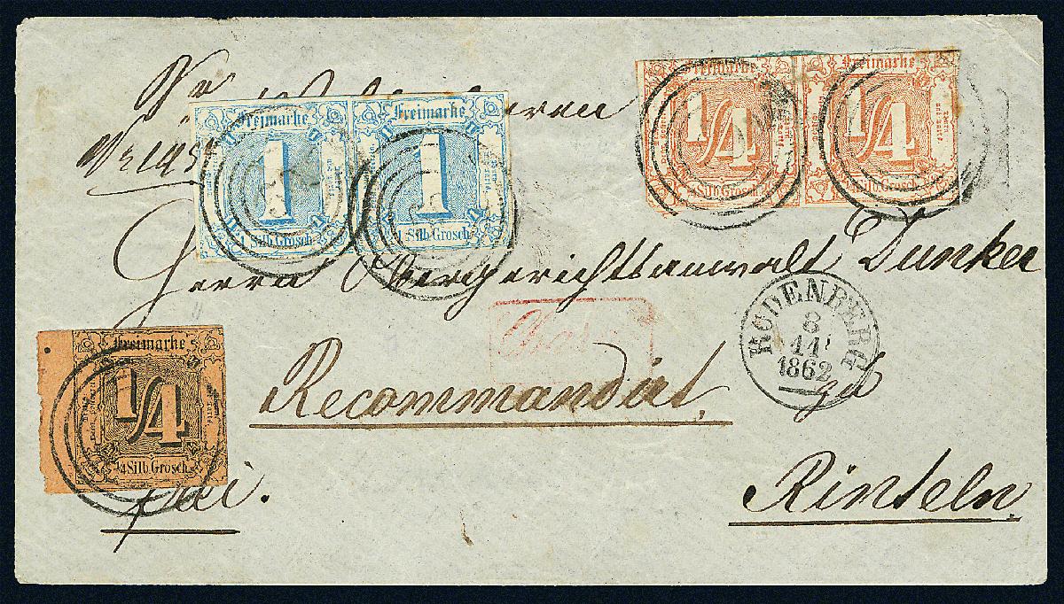 | Zusatzinformationen und Suchstichworte: | Dr. Derichs 177. Auktion 21. - 22. Juni 2024 Los 503 Altdeutschland Thurn und Taxis \WERTSTUFENGLEICHE MISCHFRANKATUR = FRANKATUR-UNIKAT\: 1/4 Sgr. braunorange "I. Ausgabe", linkes Randstück mit 5mm Bogenrand in wertstufengleicher Mischfrankatur mit waagerechtem Paar 1/4 Sgr. rötlichorange "II. Ausgabe" und waagerechtem Paar 1 Sgr. blau "II. Ausgabe" auf Einschreibbrief mit Nummernstempeln "59" und Aufgabe-K1 "Rodenberg 3.11.1862" sowie nebengesetztem roten Charge-Stempel nach Rinteln. Die Marken zeigen Beanstandungen, insgesamt aber eine dekorative und beeindruckende Frankatur über 2 3/4 Silbergroschen (Briefporto bis 3 Meilen 1/2 Silbergroschen, Einschreibgebühr 2 Silbergroschen und Botenlohn 1/4 Silbergroschen). Fotoattest Sommer BPP und neues Fotoattest Sem BPP: "Ein zweiter Brief mit dieser Markenkombination lag mir bisher nicht vor." Ausruf 200,00 EUR |