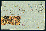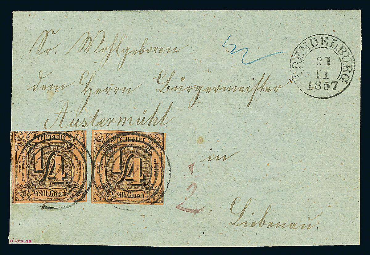| Zusatzinformationen und Suchstichworte: | Dr. Derichs 177. Auktion 21. - 22. Juni 2024 Los 506 Altdeutschland Thurn und Taxis 1/4 Sgr. schw./braunrot, zwei Exemplare, das rechte ringsum voll- bis breitrandig, das linke nur oben berührt und sonst u.a. mit Teilen zweier Nachbarmarken, als Mehrfachfrankatur auf kleinem Brief mit zweimal aufgesetztem Nummernstempel "73" und Aufgabe-K2 "Trendelburg 21/11 1857" nach Hersfeld. Eine schöne Doppelfrankatur der Michelnummer 1 dieses Sammelgebietes Ausruf 100,00 EUR |