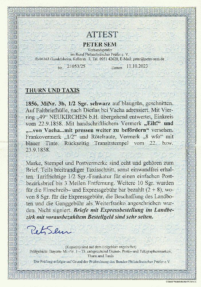 | Zusatzinformationen und Suchstichworte: | Dr. Derichs 177. Auktion 21. - 22. Juni 2024 Los 515 Altdeutschland Thurn und Taxis \EXPRESSBRIEF IM LANDBEZIRK\: 1/2 Sgr. schw./blaugrün, teils breitrandiger Taxisschnitt, Einzelfrankatur auf kleinem Brief mit Nummernstempel "49" und Aufgabe-K1 "Neukirchen b/H. 22.9.1858" nach Dietlas bei Vacha, mit vorderseitigen Vermerken "Eilt!" und "Von Vacha mit pressen weiter zu befördern". Mit Frankovermerk "1/2" und Rötelraute sowie Vermerk "8 wfo". Die Marke deckt das tarifrichtige Briefporto für einen einfachen Postbezirksbrief bis 3 Meilen Entfernung ab. Weitere 10 Silbergroschen wurden für die Einschreib- und Expreßgebühr bar bezahlt, wovon 8 Silbergroschen für die Expreßgebühr, die Beschaffung des Landboten und die Ganggebühr als Weiterfranko angeschrieben wurden. Ein für die Thematik "Expreß" eminent wichtiger Brief. Neues Fotoattest Sem BPP: "Briefe mit Expreßbestellung im Landbezirk mit vorausbezahltem Bestellgeld sind sehr selten." Ausruf 400,00 EUR |