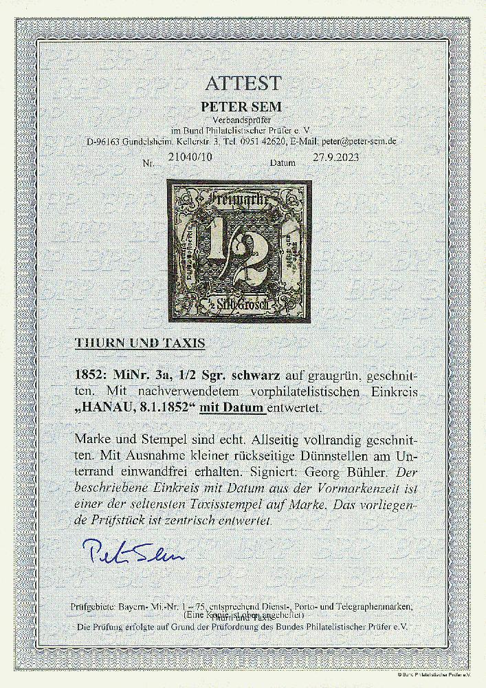 | Zusatzinformationen und Suchstichworte: | Dr. Derichs 177. Auktion 21. - 22. Juni 2024 Los 517 Altdeutschland Thurn und Taxis \VERSUCHSSTEMPEL "HANAU" MIT DATUMSEINSATZ\: 1/2 Sgr. schw./graugrün, allseits vollrandig und mit Ausnahme kleiner rückseitiger Dünnstellen am Unterrand einwandfrei, zentrisch und gerade gestempelt mit K1 "Hanau 8.1.1852" (MIT Datum!). Fotoattest Dr. Sommer BPP und neues Fotoattest Sem BPP: "Der beschriebene Einkreis mit Datum aus der Vormarkenzeit ist einer der seltensten Taxisstempel auf Marke." Ausruf 200,00 EUR |