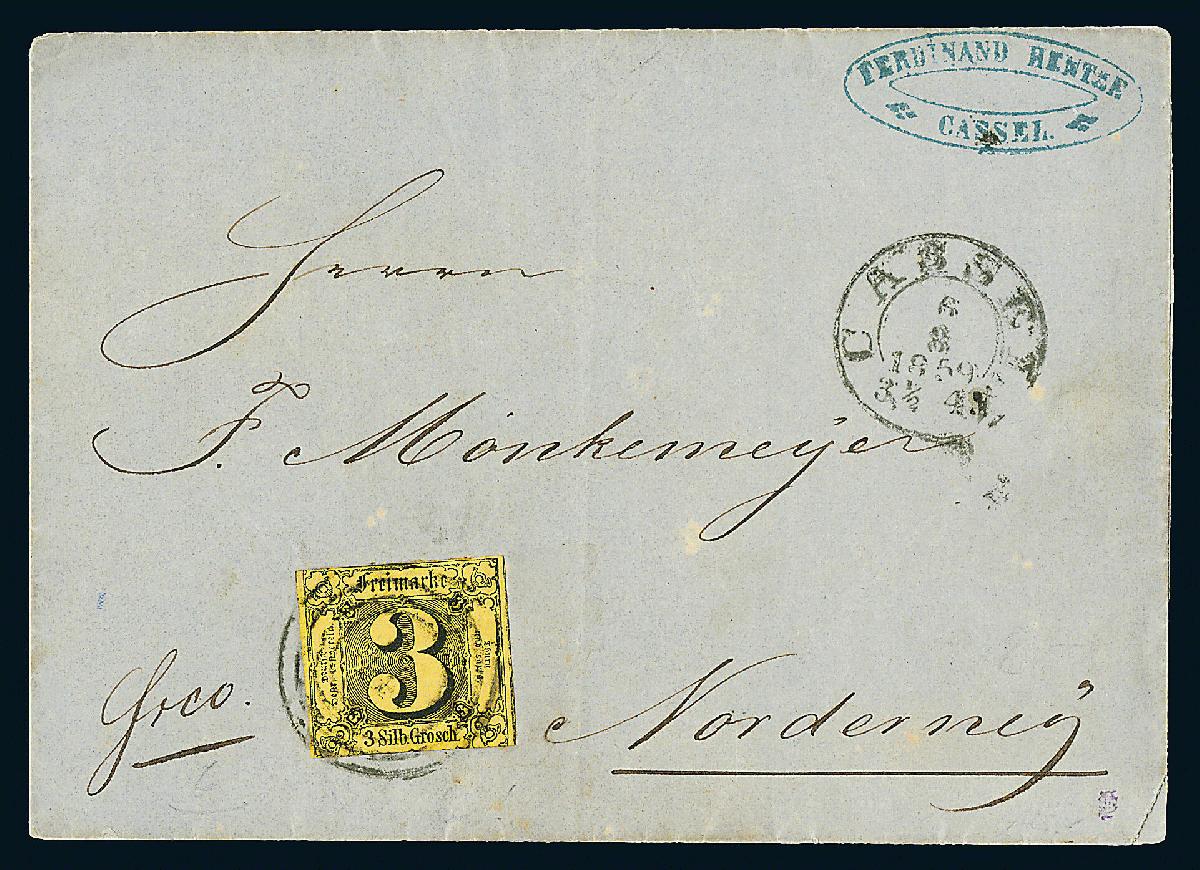 | Zusatzinformationen und Suchstichworte: | Dr. Derichs 177. Auktion 21. - 22. Juni 2024 Los 526 Altdeutschland Thurn und Taxis \INSELBRIEF\: 3 Sgr. schw./maisgelb, Taxisschnitt (links und rechts teils überrandig mit Teilen der Nachbarmarken), als Einzelfrankatur auf Postvereinsbrief mit Nummernstempel "14" und Aufgabe-K2 "Cassel 6.8.1859" nach Norderney. Die Insel gehörte zum Königreich Hannover. Tarifrichtige 3-Silbergroschen-Frankatur für einen Brief in den Postverein mit mehr als 20 Meilen Entfernung. Fotoattest Sem BPP: "Mir lagen bisher nur wenige Briefe nach Norderney vor. Eine ungewöhnliche innerdeutsche Destination.". Ausruf 100,00 EUR |