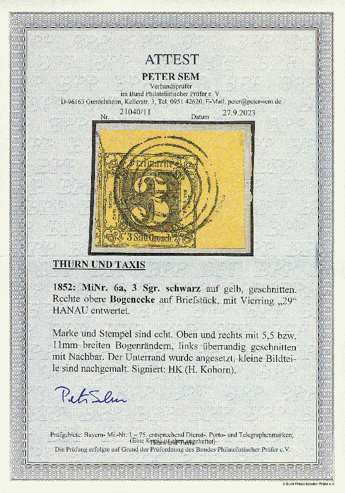 | Zusatzinformationen und Suchstichworte: | Dr. Derichs 177. Auktion 21. - 22. Juni 2024 Los 527 Altdeutschland Thurn und Taxis \BOGENECKE OBEN RECHTS\: 3 Sgr. schw./gelb, rechte obere Bogenecke mit 5,5mm breitem Oberrand und 11mm breitem Seitenrand, links auf voller Länge mit Teil der Nachbarmarke, Unterrand aus optischen Gründen verbreitert, auf Briefstück mit Nummernstempel "29" HANAU. Eine ungewöhnlich große und attraktive Taxis-Bogenecke. Ausruf 120,00 EUR |