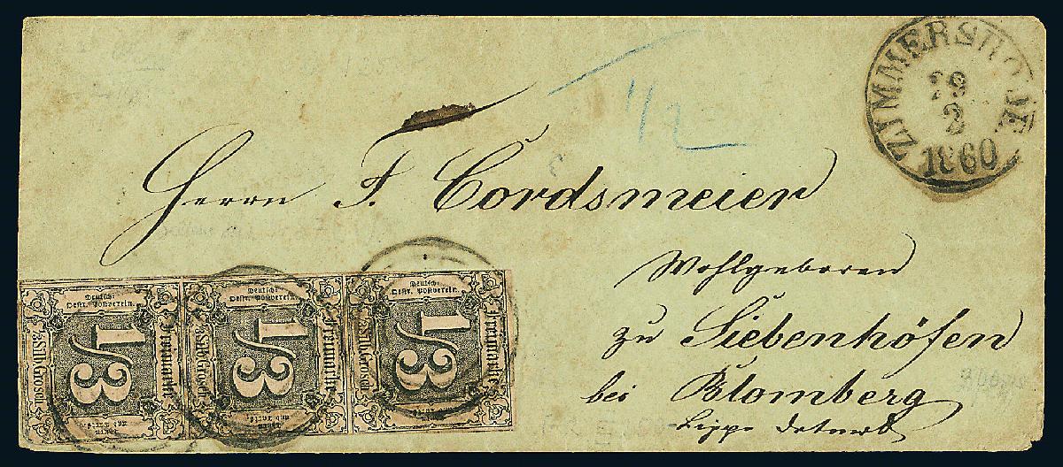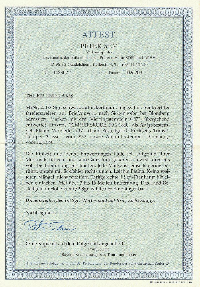 | Zusatzinformationen und Suchstichworte: | Dr. Derichs 177. Auktion 21. - 22. Juni 2024 Los 529 Altdeutschland Thurn und Taxis 1/3 Sgr. schw./hellbraunocker, senkrechter Dreierstreifen in teils überrandigem Taxisschnitt (rechts unten Ecke abgerundet) auf kleinem patinierten Brief mit Nummernstempeln "87" und Aufgabe-K1 "Zimmersrode 29.2.1860" nach Siebenhöfen bei Blomberg. Dreierstreifen dieser einzeln schon guten Marke sind auf Brief sehr selten, insbesondere aus einem kleineren Ort wie Zimmersrode. Eine Thurn & Taxis-Seltenheit. Ausruf 600,00 EUR |