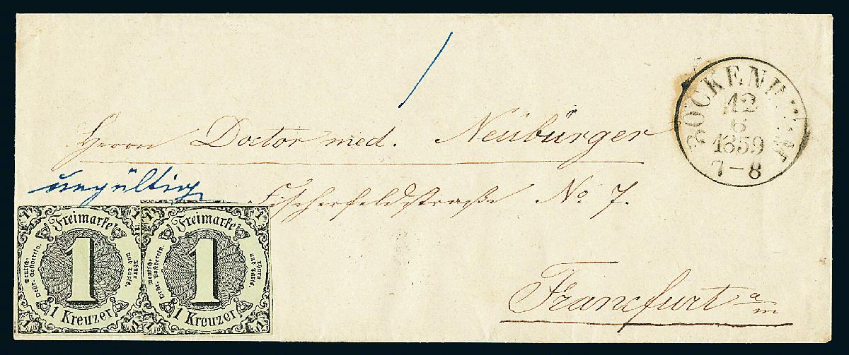 | Zusatzinformationen und Suchstichworte: | Dr. Derichs 177. Auktion 21. - 22. Juni 2024 Los 531 Altdeutschland Thurn und Taxis 1 Kr. schw./graugrün, zwei Exemplare in gutem Taxisschnitt als Paar geklebt auf kleinem weißen Kuvert als Nahbereichsbrief mit Aufgabe-K1 "Bockenheim 12.6.1859" nach Frankfurt/Main. Die Marken blieben unentwertet und über diesen handschriftlicher Tintenvermerk "ungültig". Bockenheim war Silbergroschen-Gebiet und Frankfurt Kreuzer-Gebiet. Das Nahbereichsporto hätte 1/4 Silbergroschen plus 1/4 Silbergroschen Bestellgeld gekostet. Der Absender frankierte zwar entsprechend in Kreuzer-Währung (1 Kreuzer Nahbereichsporto und 1 Kreuzer Bestellgeld), doch die währungsfremde Frankatur wurde nicht anerkannt. Ausruf 250,00 EUR |